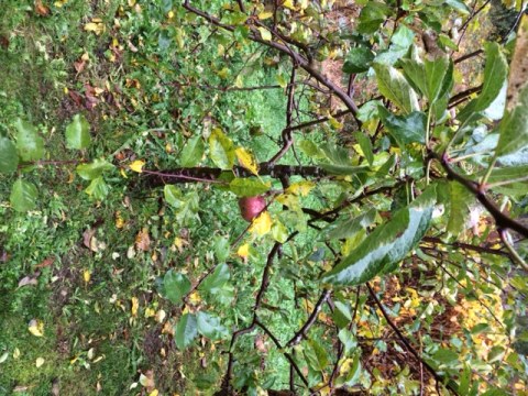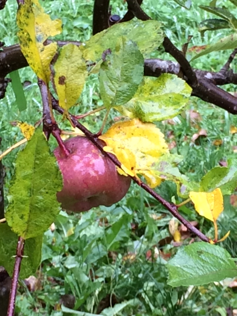 Not far from the pond the apple trees I planted five years ago blossomed in the spring and were heavy with apples this year. I filled a few buckets to give away to ladies who make pies and was waiting to harvest the rest ‘when I felt like it’. One Saturday in the dark of night intruders entered the fenced garden and the next morning we had a surprise awaiting. The garbage can was on it’s side, the recycling bin was empty with teeth marks on the lid, and the apple trees were naked. Nothing left except a broken branch, trampled undergrowth, and one solitary apple clinging to a ravaged tree.