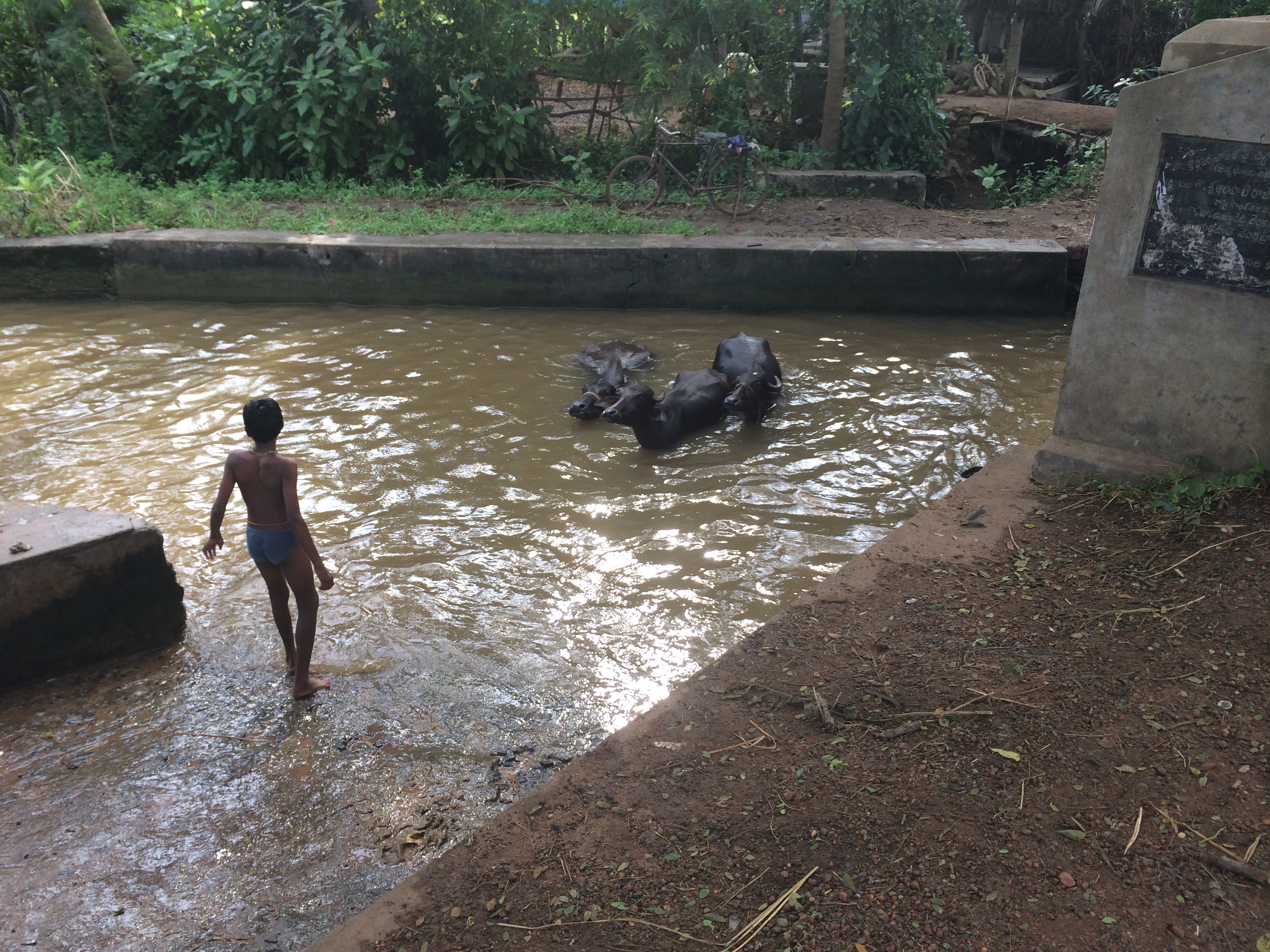 We returned via the rice fields to check that the one being farmed for the orphanage was undamaged. Mercifully all was well… others were working to tie flattened plants in bundles to stay upright and thus at least rescuing something from the disaster. Left alone the rice will just re germinate in the water and be useless.Meanwhile the water buffalo are everywhere and more often than not looking for water to be lovingly washed and cooled by their owners.