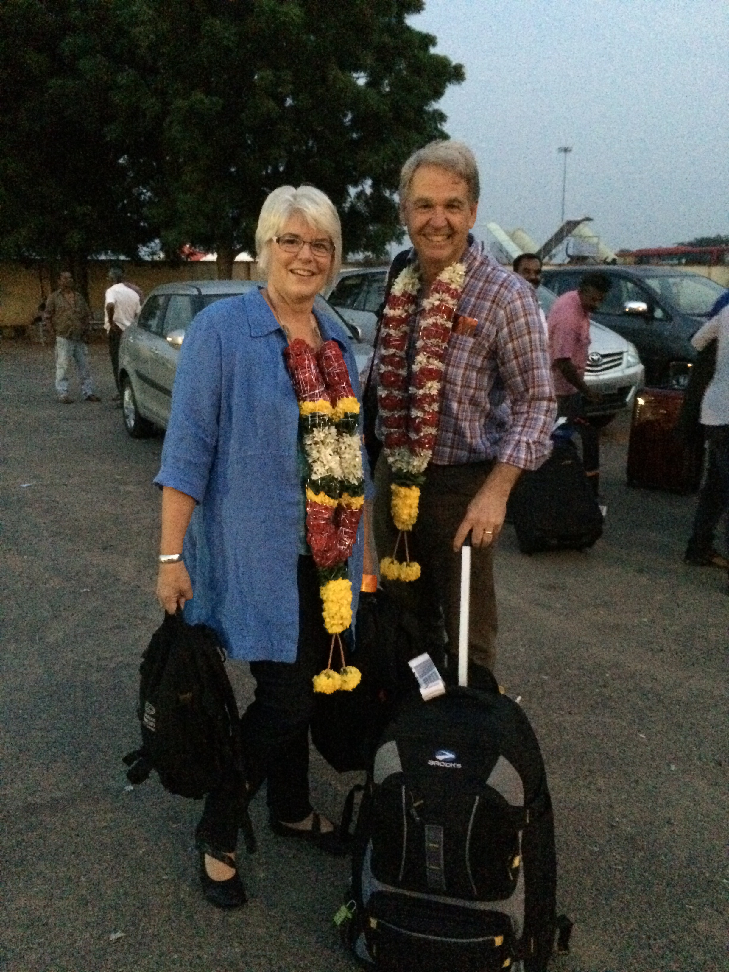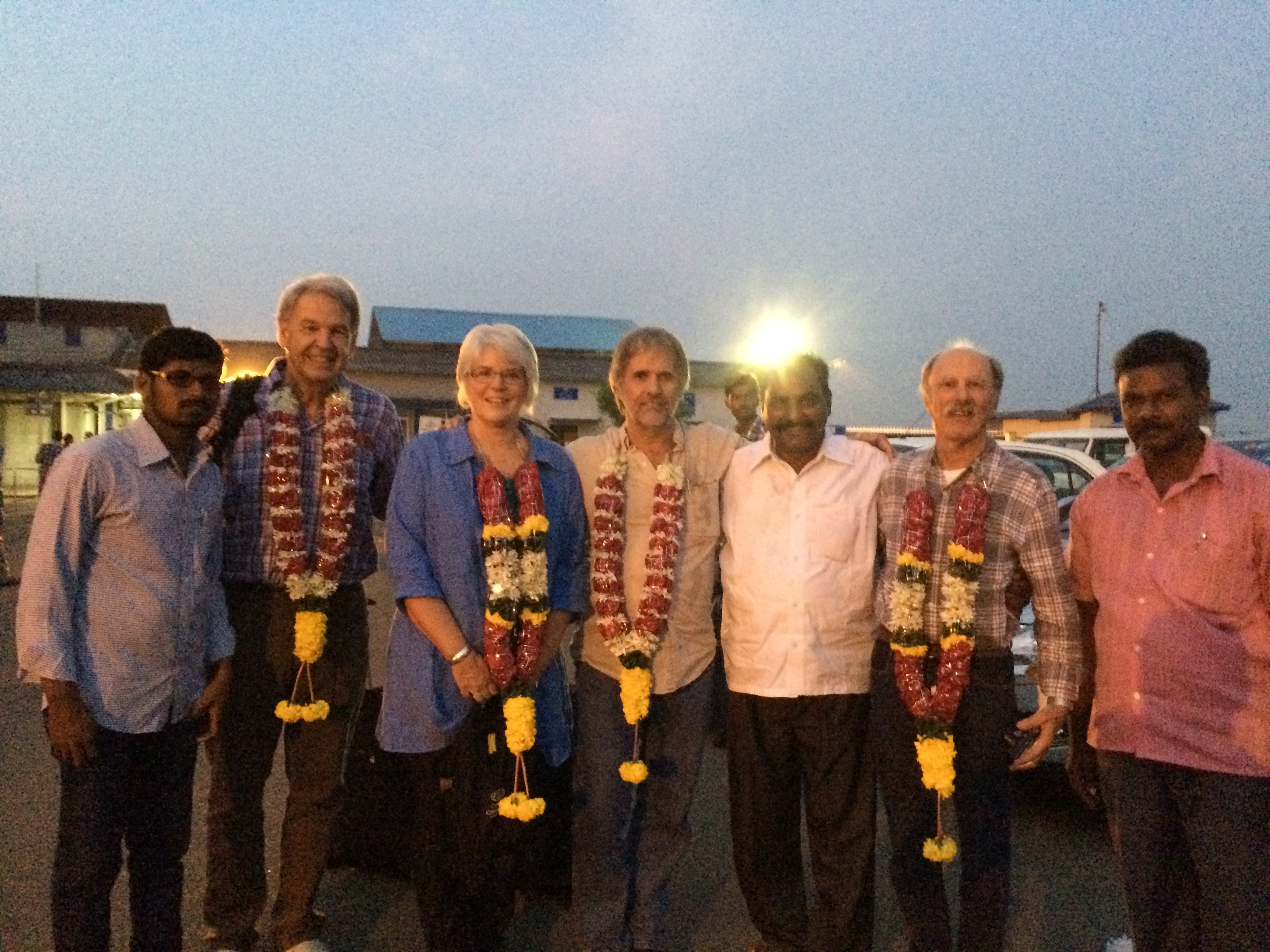The sun sank with us on our descent into Vijayawada… a modest airport with one runway and a small reception area; army guards standing watch at strategic points. Our flight was delayed by an hour out of Delhi bot otherwise all went smoothly on this last leg. Sanjeeva, father of Raj and Rao, met us with his sons at the airport with the customary floral garlands pungent with the fragrance of fresh flowers.Their greeting was warm and genuine… they are so appreciative of us coming back and I find their thanks humbling.
