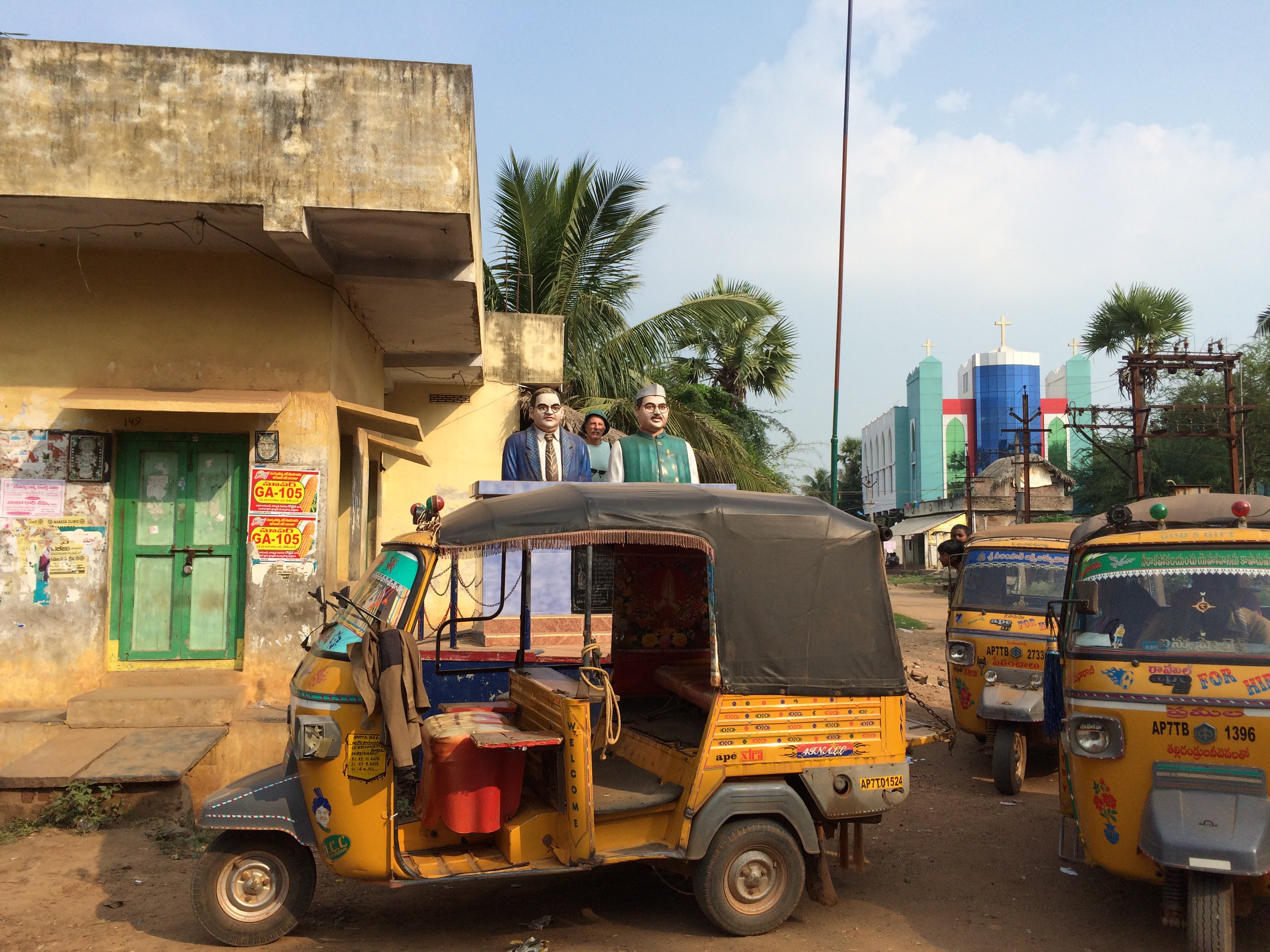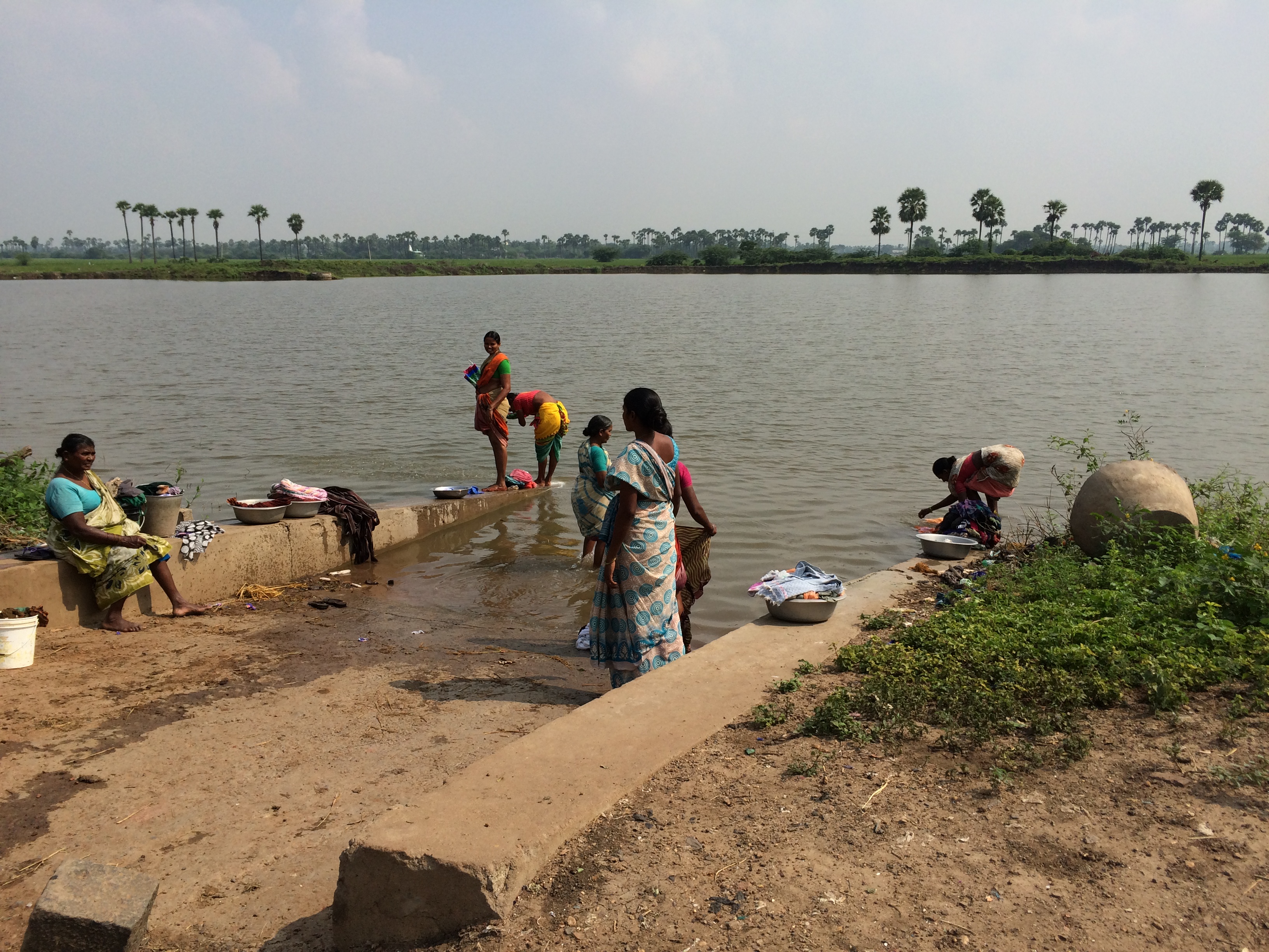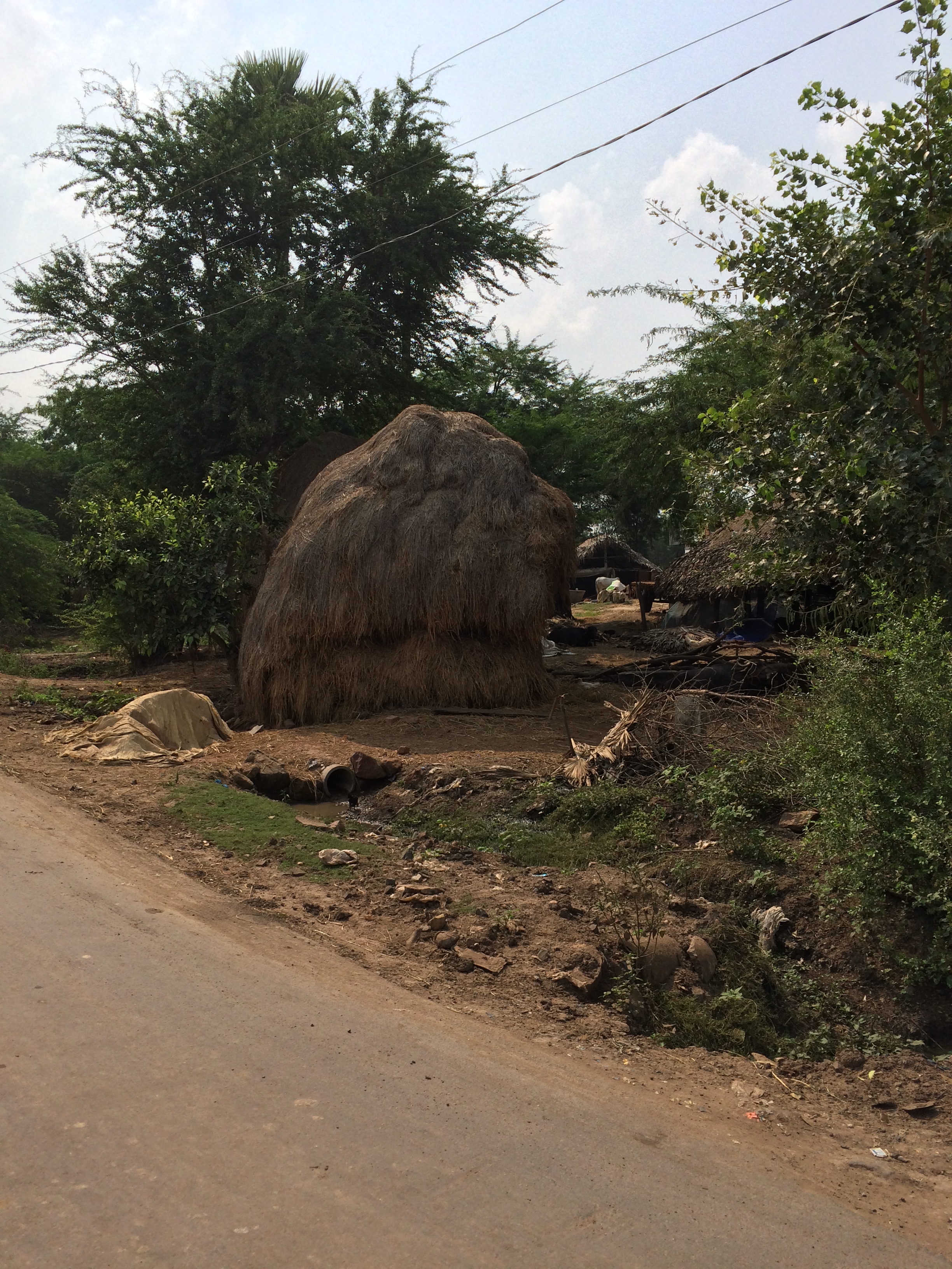 Our drive there is a forty five minute winding bumpy road through gorgeous green rice fields and countless villages packed with bicycles, sleeping dogs. lumbering water buffalo, and people conversing at every turn. Women must do washing on Mondays as they hunched over in colorful saris slapping clothing and chatting in ditches and small lakes. Another feature I love are the old English style haystacks everywhere…. looks like 18th century scenes and the subject of a Constable painting.