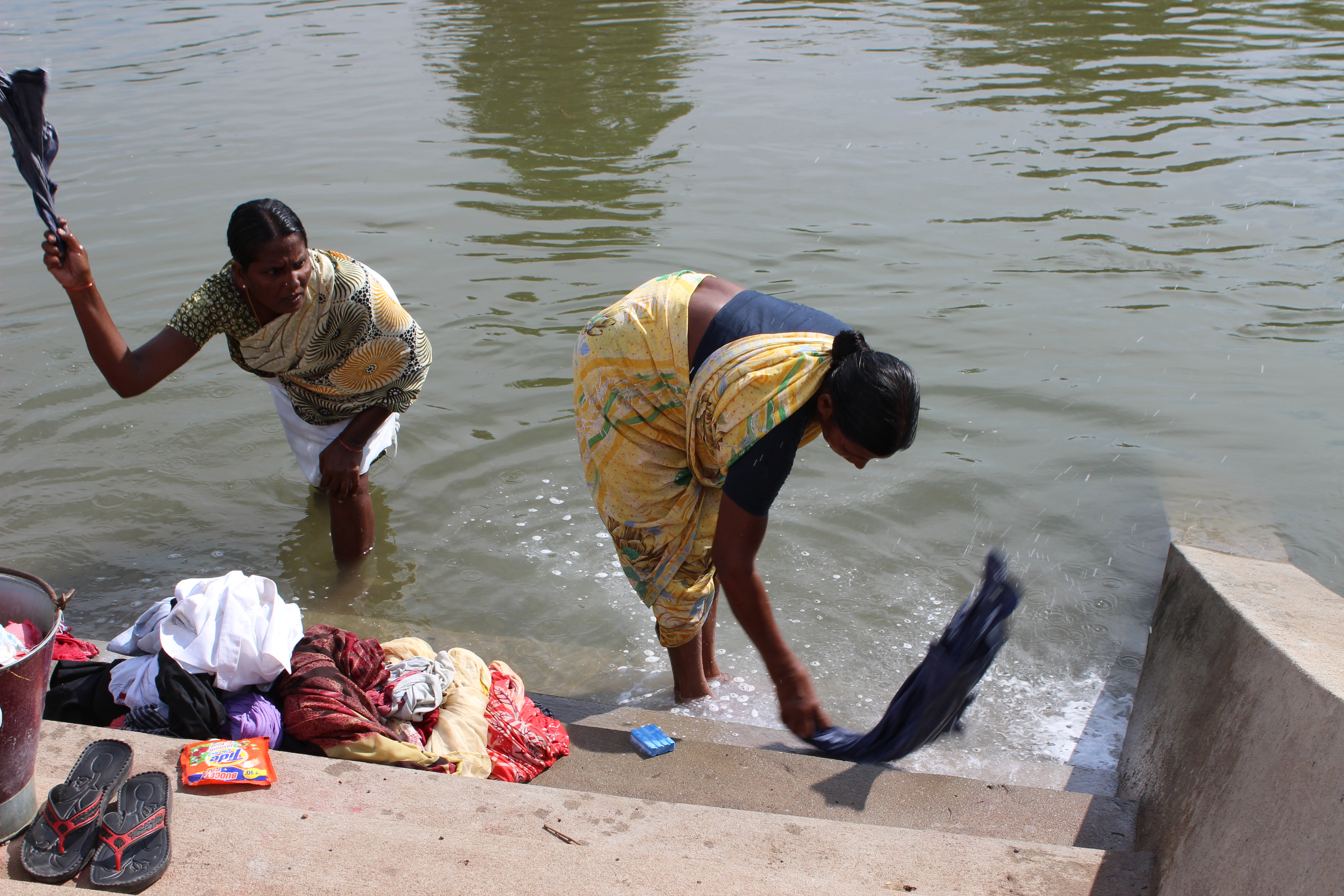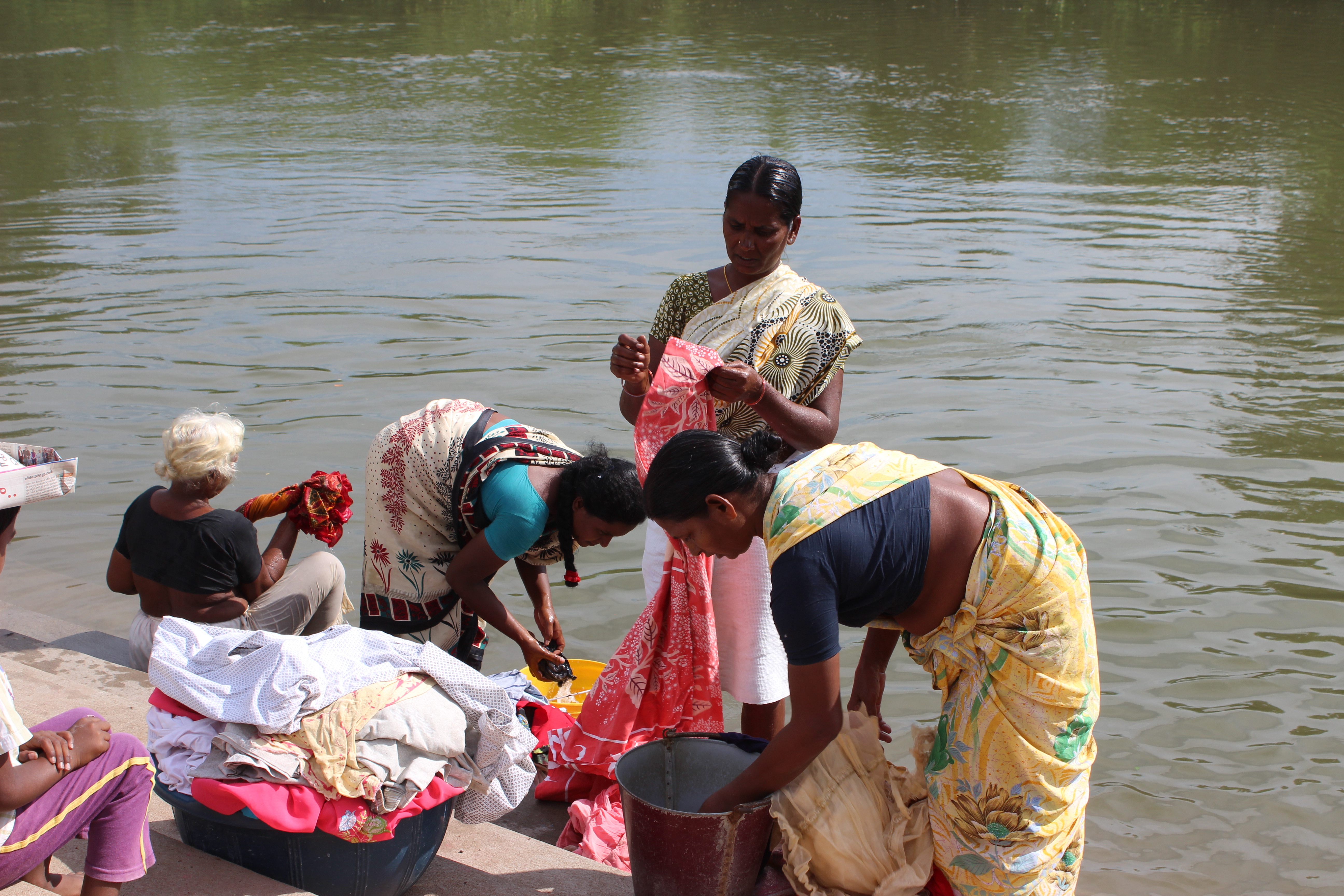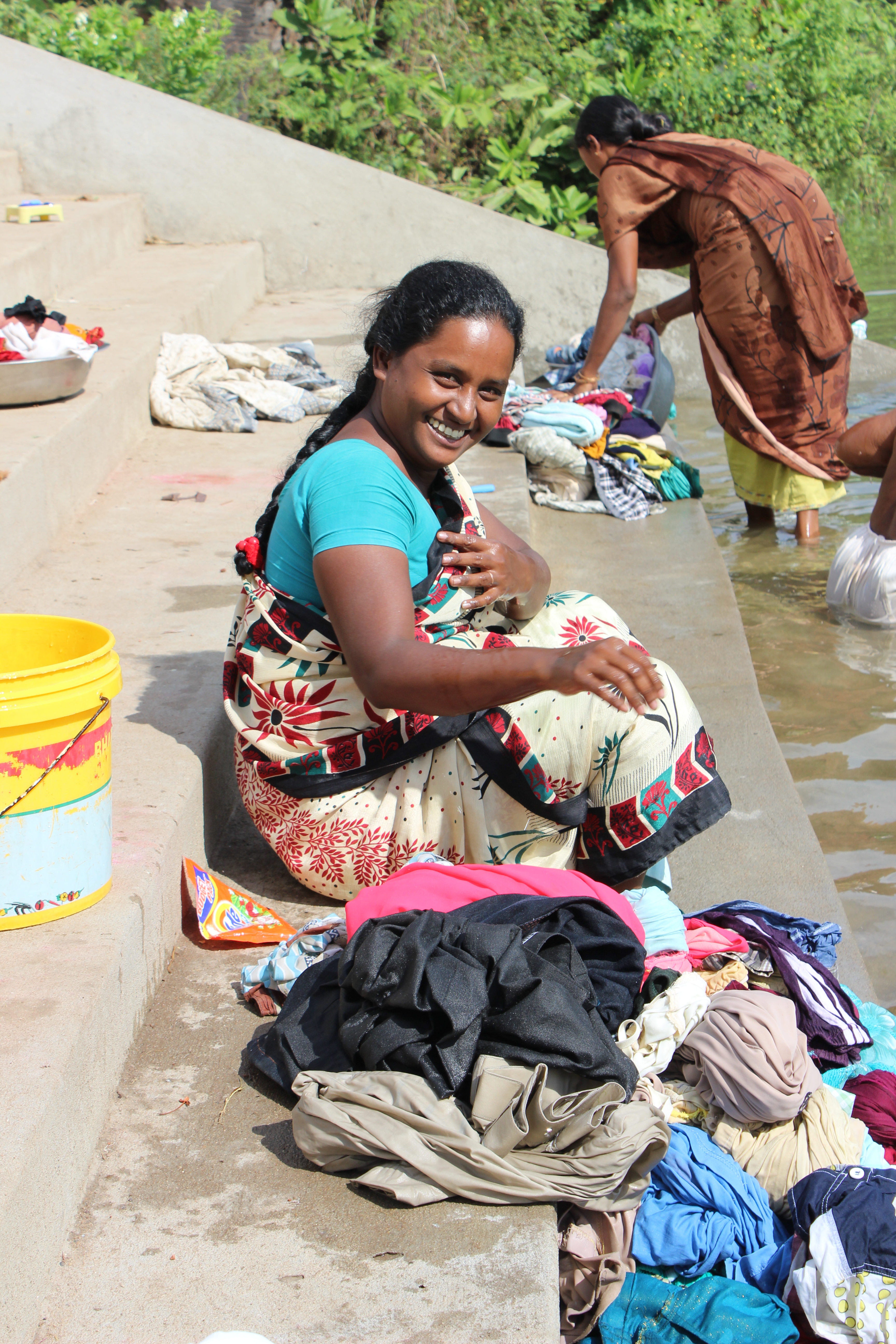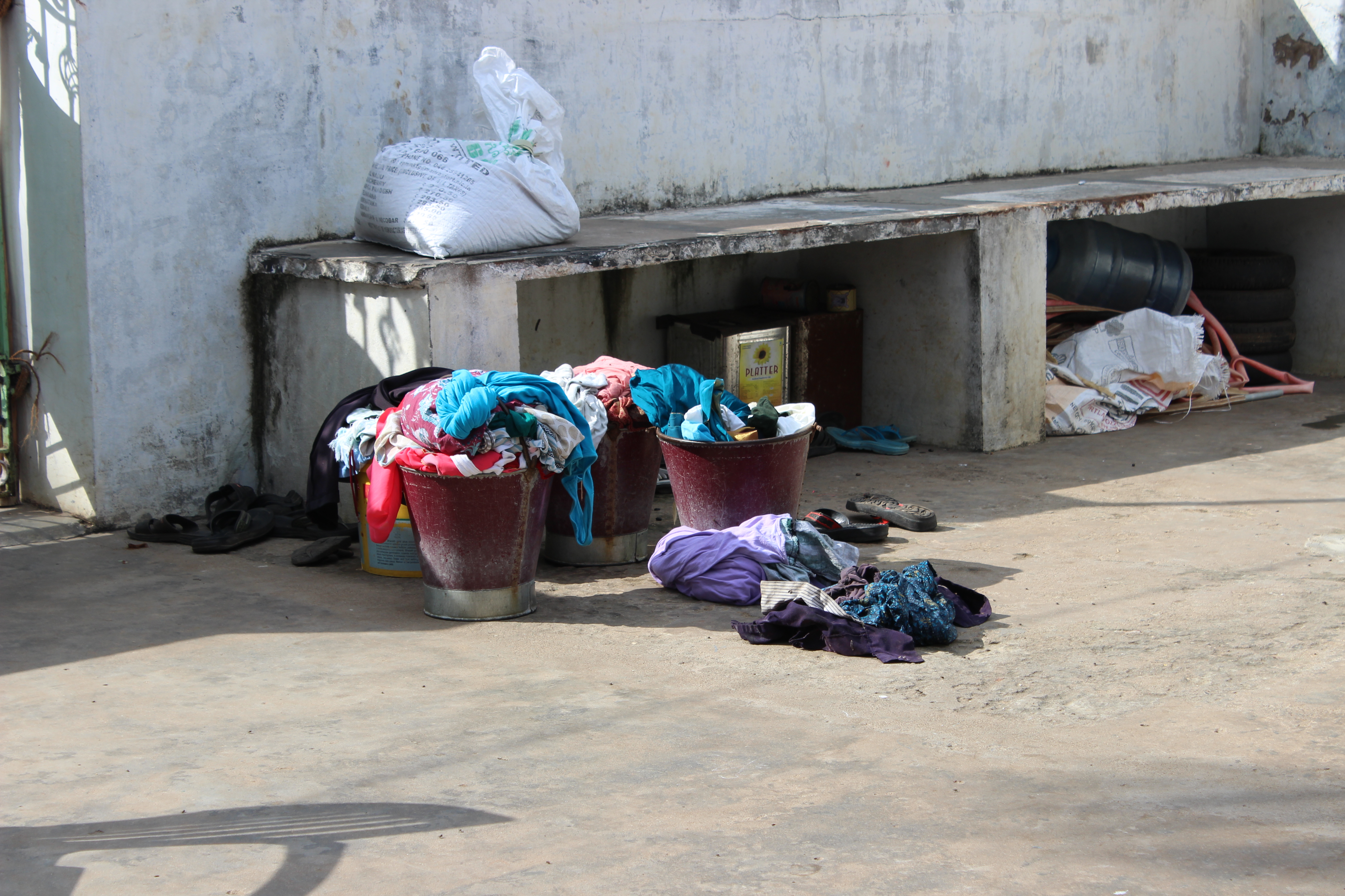 As I entered the courtyard, the first task was evident….. Laundry for 38. Laundry is done regularly and whenever we come into the courtyard the walls are draped in dresses, towels and pants – but Monday is a major wash day so the pile was enormous. We headed down the street to the river where a set of concrete steps into the flowing water serves as the laundromat. They will not let me carry or help but have agreed to let me take photos.
