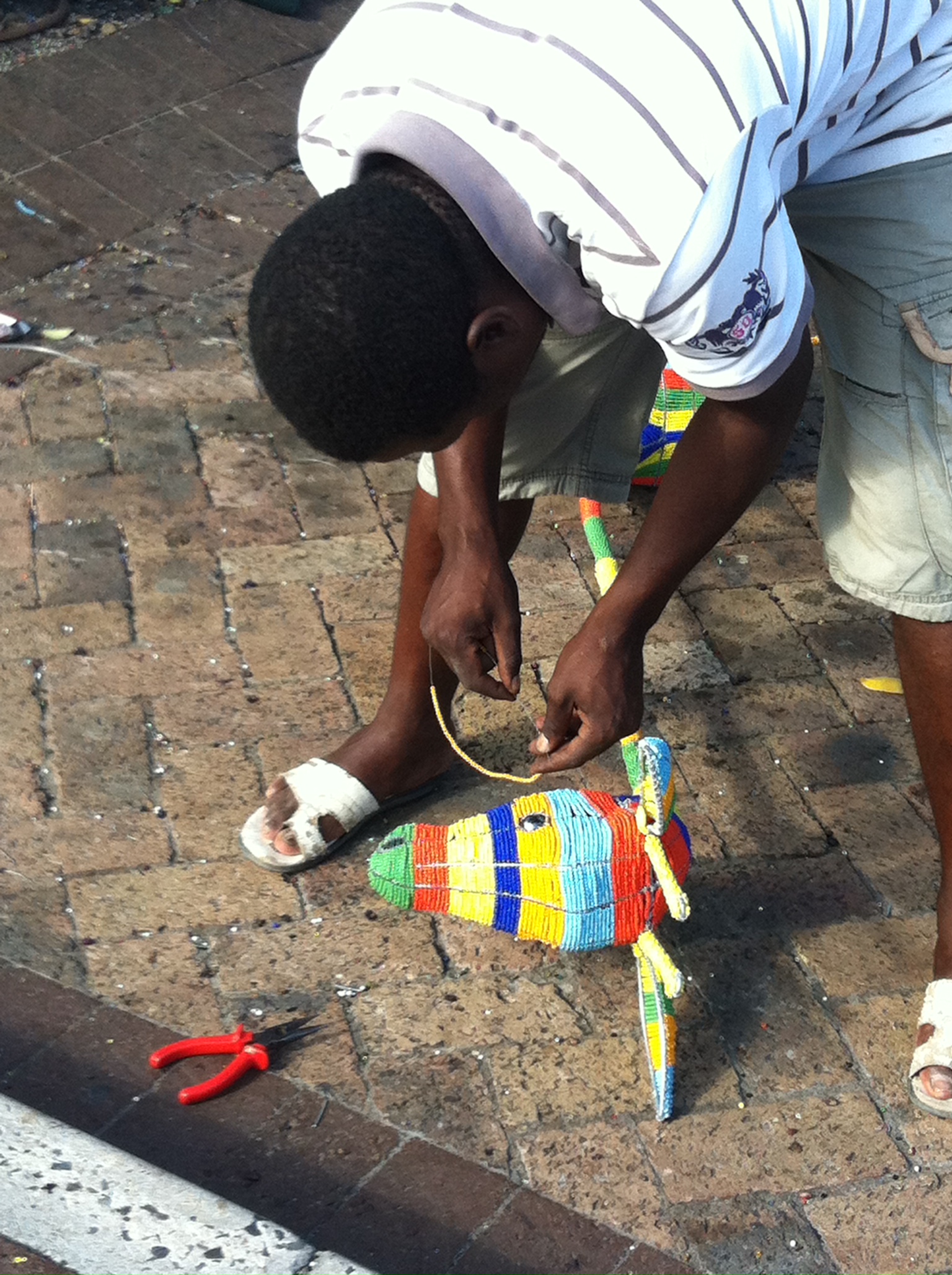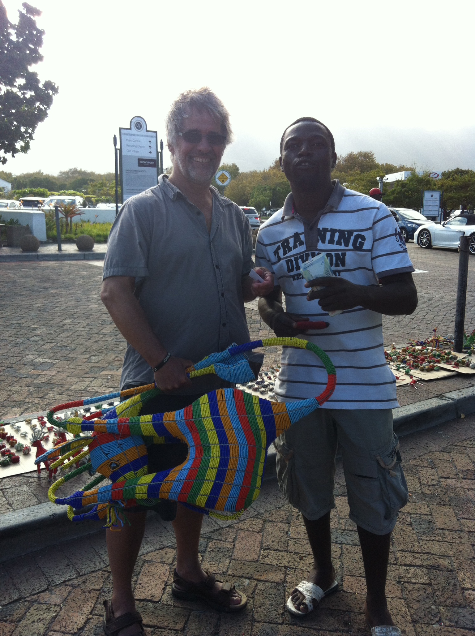 “I really like the large one,” I said. “But we live in Canada and he’ll never fit on the airplane.” “No problem, I can fold him up for you and he’ll be fine.” “Ok,” I said. We agreed on a price and I went off to find an ATM machine. I don’t haggle in Cape Town with vendors. The work they put into their craft is never covered by the price they ask and with the privilege of a great exchange rate I can afford to pay more. When we returned my new friend was tied up in a bundle and released from his creator with a beaming smile.