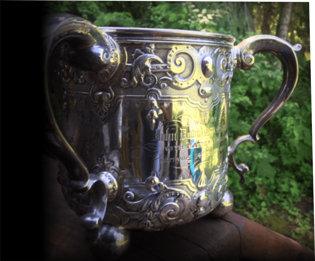 Elfra arrived in Port Alberni with her parents as a young girl. She was very close to her father who’d immigrated to Canada from Ireland. When she downsized she gave me her grandfather’s large silver trophy for winning a horse race in Ireland: The Killultagh Hunt Welter Cup, Run for over the Whinny Hill Course, 10th April, 1880. Won by John Davidson Esquire with Master William carrying 14 stone Three Miles. Unfortunately Elfra’s dad suffered a major heart attack at a relatively young age leaving her mother and her to share a home for many years.