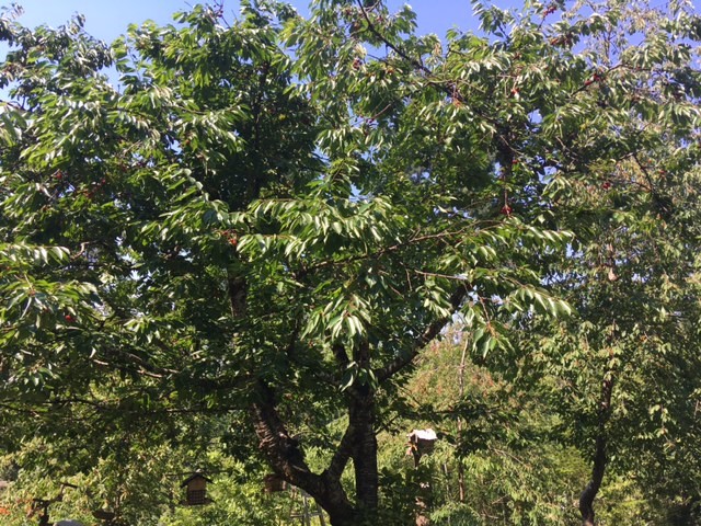 And in the middle of the garden stand a grand old cherry tree. The branches have been laden with cherries, the leaves healthy and green. Throughout this heat wave there’s no hint of withering. In fact the branches spread out wide providing shade and shelter for the potted plants we’ve placed beneath for protection.