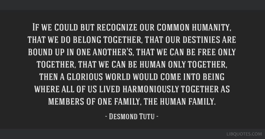 When God surveys and engages humanity, humanity is all he sees. Human beings, united in their physical make-up as their source of unity and identity; arms , legs, eyes, ears, etc. Skin-color, tribes, ethnicity, is irrelevant. God has no favorites: not in Jerusalem or Gaza, not rich or poor, not the educated or those less privileged, neither Democrat or Republican (insert every political party in the world, every religion and denomination).